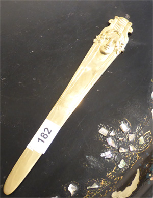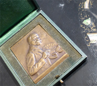 Des pièces inattendues, bijoux, coupe-papier en bronze, grand vide-poche 1900 en bronze Marionnet, et médaille réalisée par Prouvé à l’effigie de Friand.