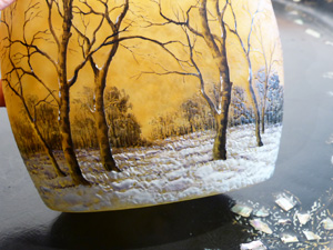 Particularité des productions Muller, des objets qui présentent jusqu’à 5/6 couches de verre et donnent un étonnant décor en transparence.