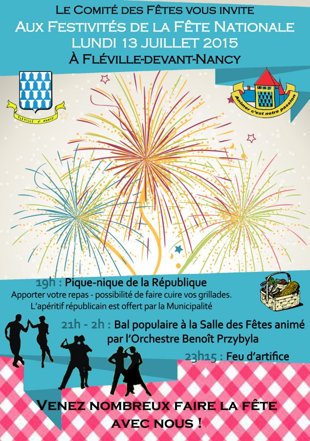 Pour célébrer la Fête Nationale, la commune de Fléville organise, aux alentours de la Salle des Fêtes, un pique-nique républicain, un bal populaire et un feu d’artifice le lundi 13 juillet 2015.