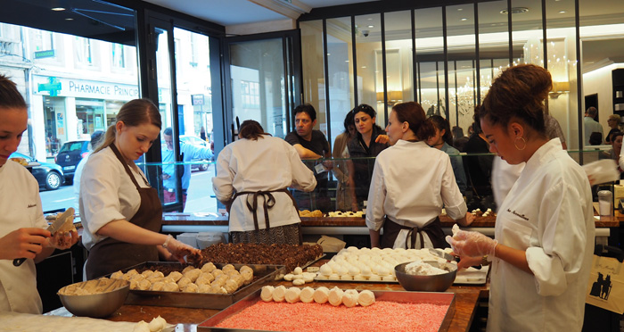 A la fois pâtisserie et salon de thé ou adresse pour le déjeuner, les merveilleux sont enrobés sous nos yeux et les cramiques qui cuisent dans le four central nous allèchent !
