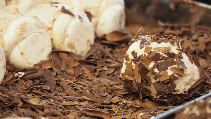 Les merveilleux ce sont des meringues enrobées de crème fouettée et roulées dans des copeaux de chocolat, enrobées de noisettes et d’éclats d’amandes ou cristallisées de café…
