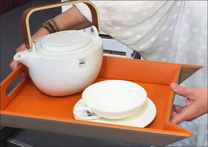 des plateaux bicolores FreeForm (à nos ordres) qui se dressent quand on les porte et s’aplatissent sur la table, imitation cuir, bicolores, 2 tailles.
