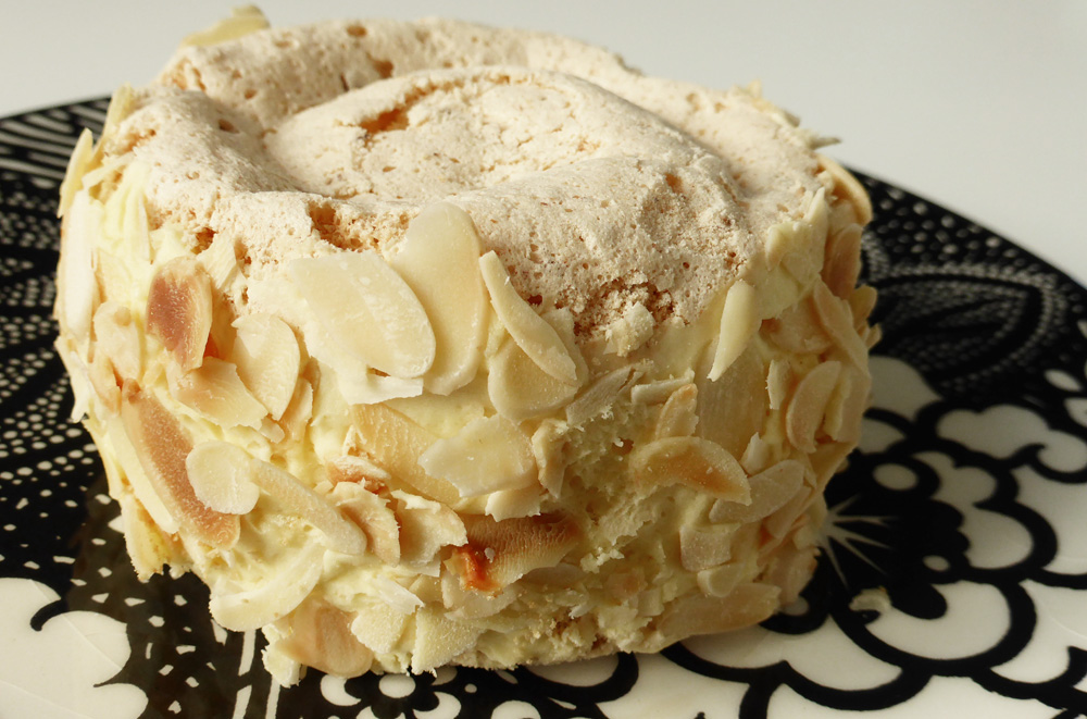 Crème au beurre vanille, meringue aux amandes, éclats de croquante
