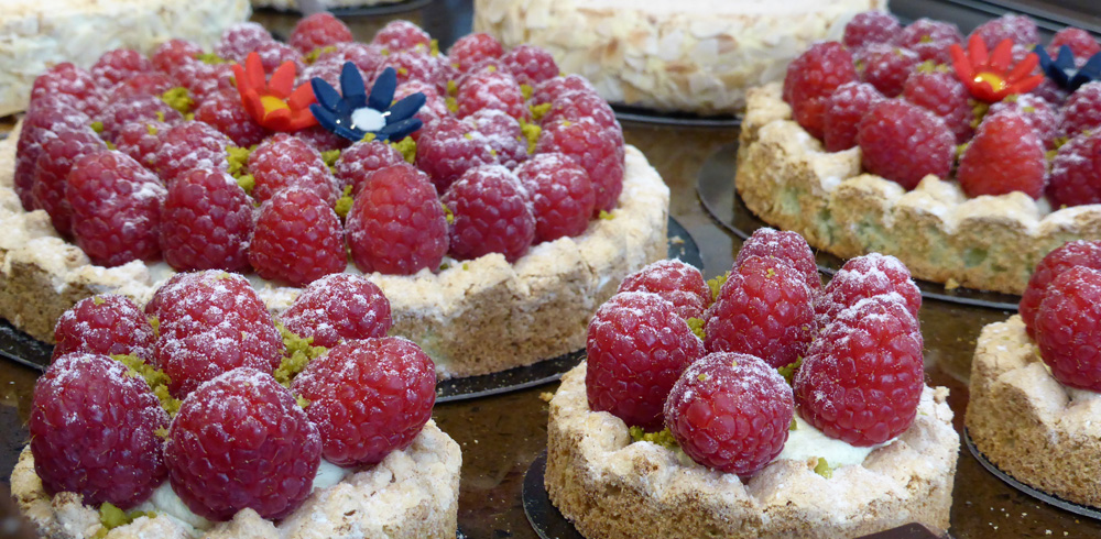Dacquoise et mousseline pistache, framboises fraîches uniquement ( parfois jusqu’à 4 barquettes ! )