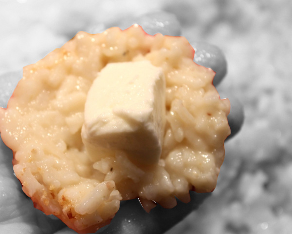 -Dans vos mains, prélevez un peu de risotto et insérez un morceau de mozarella au centre.