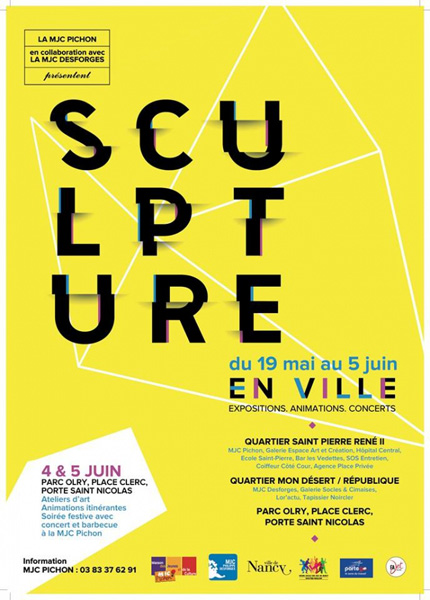 La MJC Pichon organise en partenariat avec la MJC Desforges et le soutien de la Ville de Nancy « Sculpture en Ville ». Ce week-end des arts sur un parcours itinérant emportera le visiteur à la découverte de 20 lieux d’exposition au sein des quartiers Saint Pierre, René II, Bonsecours et Mondesert.