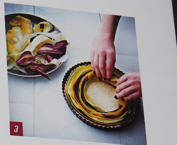 -Disposer les tagliatelles de légumes en spirale sur la pâte précuite.